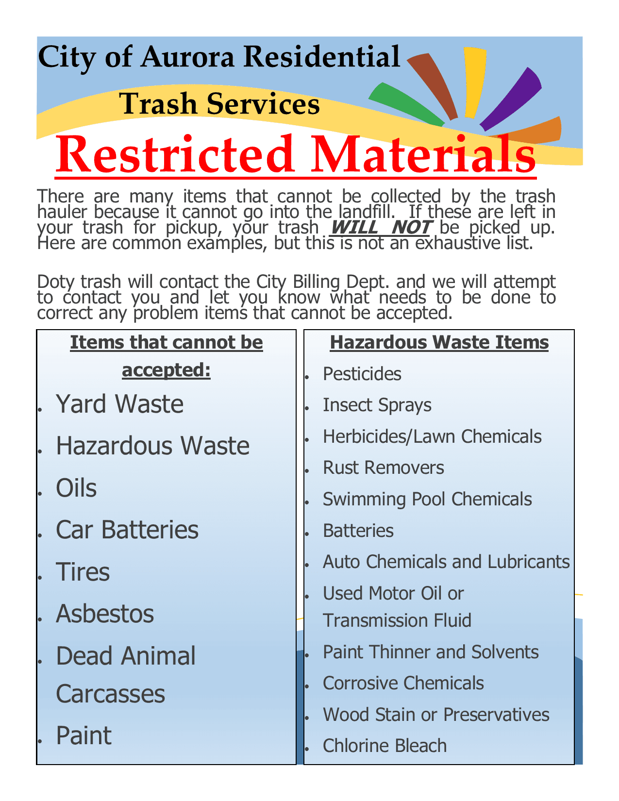 There are many items that cannot be collected by the trash hauler because it cannot go into the landfill. If these are left in your trash for pickup, your trash WILL NOT be picked up. Here are common examples, but this is not an exhaustive list. Doty trash will contact the City Billing Dept. and we will attempt to contact you and let you know what needs to be done to correct any problem items that cannot be accepted. Restricted Trash Information Sheet