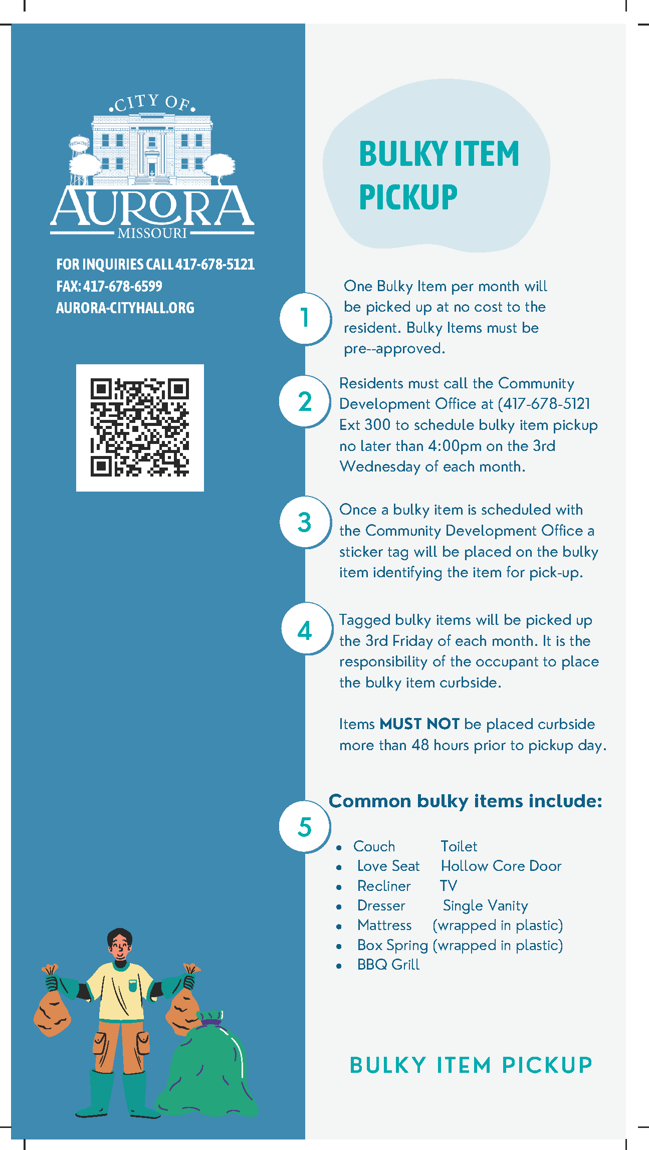 City of Aurora Residential Trash Services customers will receive bulky item pickup service as part of their monthly service. One bulky item per month will be picked up at no cost to the resident. These items are larger items that are usually an extra cost to the customer for the trash collector to pick up; the City has added this service to your regular service with no extra cost to the customer.