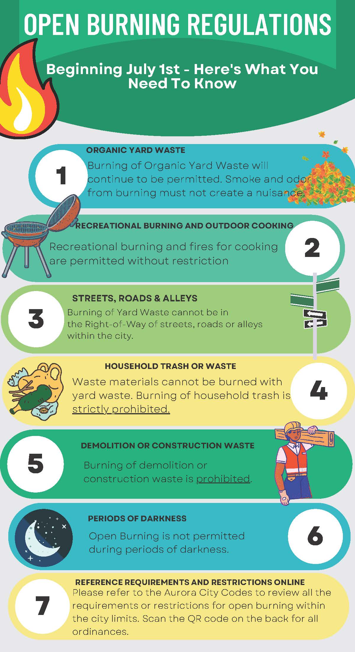 Beginning July 1, 2023, several new regulations concerning Open Burning will go into effect for the City of Aurora. Enforcement of these regulations will begin on July 1, 2023. These regulations will be a change for our community, so we encourage citizens to get familiar with them early! The biggest of these regulations will be that the burning of household trash will not longer be allowed, but there are other aspects of the regulations that will affect how you may have done things in the past regarding open burning.